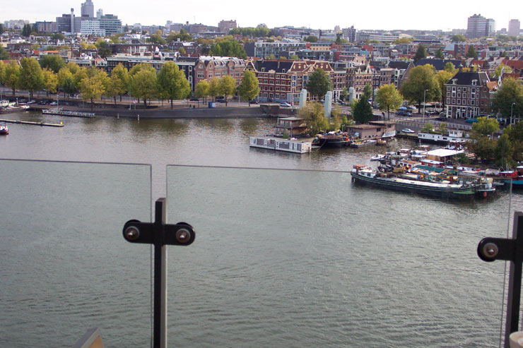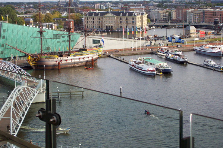 Uitzicht vanaf de 7de verdieping van het nieuwe gebouw van de Openbare Bibliotheek Amsterdam aan het Oosterdok.
